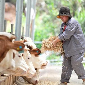 5月18日,工人在貴州省黔東南苗族侗族自治州黃平縣新州鎮黃飄村給自家飼養的牛投飼料。