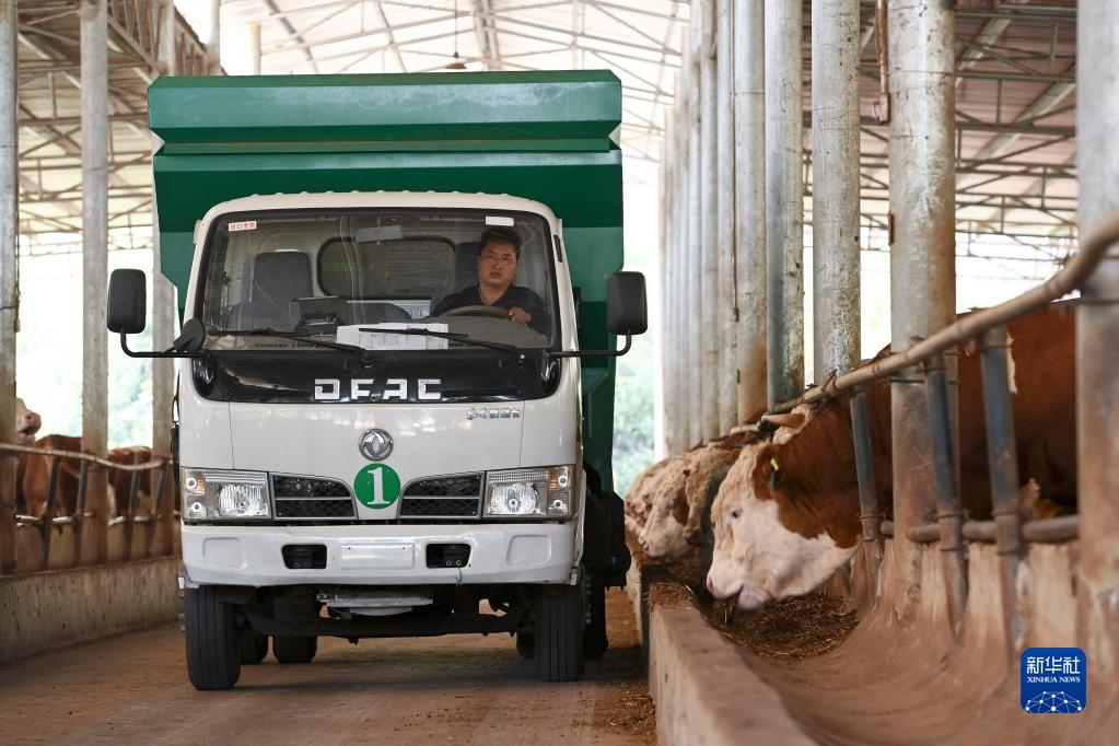 5月17日,飼料運送車(chē)在貴州省黔東南苗族侗族自治州黃平縣谷隴鎮肉牛養殖基地給肉牛投飼料。