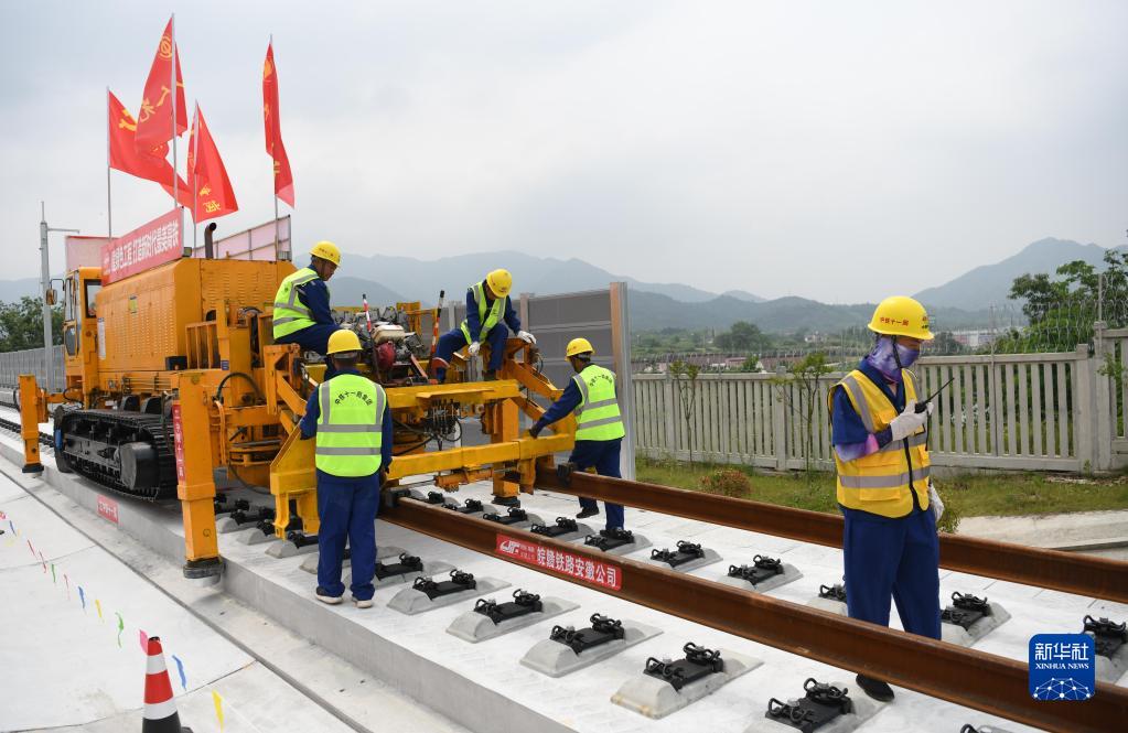 5月18日,中鐵十一局施工人員在池黃鐵路鋪軌施工現場(chǎng)作業(yè)。