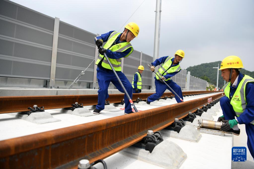 5月18日,中鐵十一局施工人員在池黃鐵路鋪軌施工現場(chǎng)作業(yè)。
