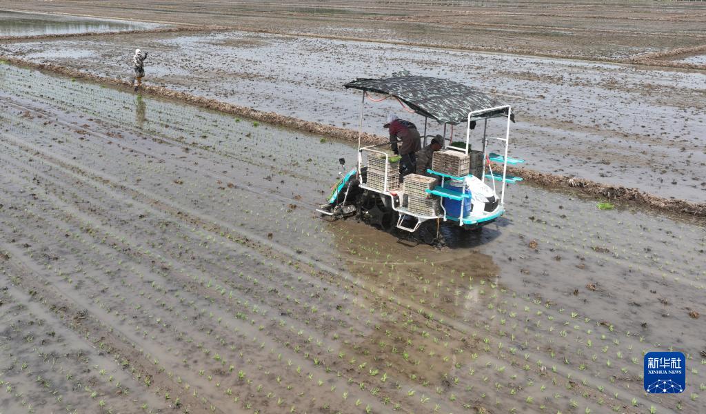 5月18日,河北唐山豐南區岔河鎮楊義口頭一村農民在水稻田使用農機插秧(無(wú)人機照片)。