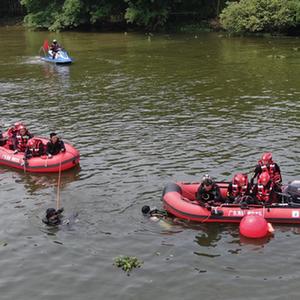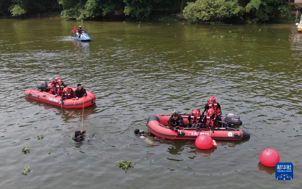 5月18日,參加演練的消防人員進(jìn)行潛水打撈舟艇作業(yè)(無(wú)人機照片)。