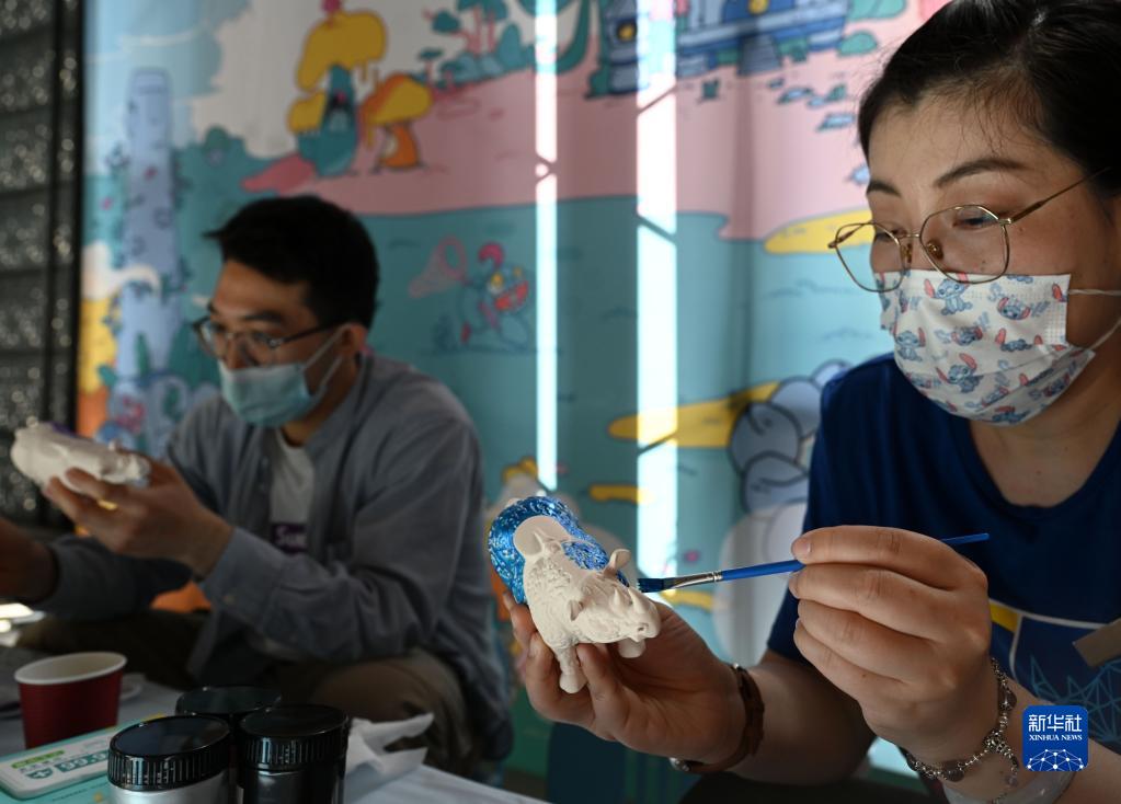 5月18日,市民在犀牛尊素胚上涂色。犀牛尊以國博館藏重器“錯金銀云紋青銅犀尊”為原型。