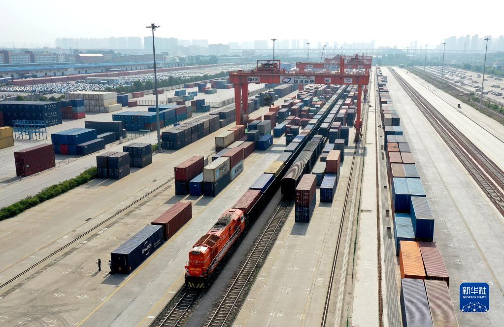 5月18日,X9021次中亞班列(鄭州)駛出中國鐵路鄭州局集團有限公司圃田車(chē)站(無(wú)人機照片)。