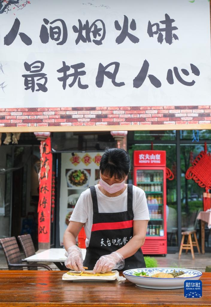 5月17日,在天臺山游客中心,天臺記憶餐廳的工作人員制作當地特色美食“餃餅筒”。