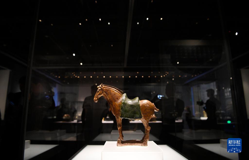 圖為西夏博物館展出的唐三彩披泥障馬(5月18日攝)。