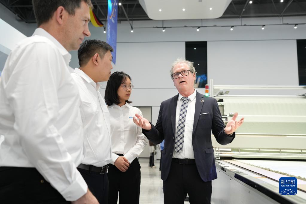 5月18日,在臨海拓卡奔馬機電科技有限公司,德方工作人員和中方員工討論產(chǎn)品細節。