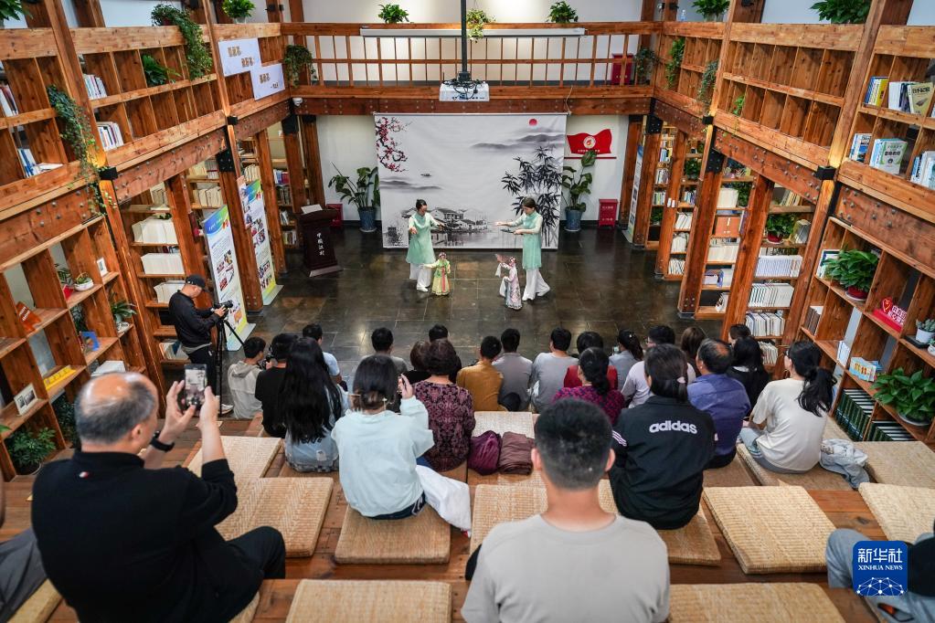 5月17日,孫菁(左)、施錦芳在七都鎮江村文化禮堂表演昆曲木偶《牡丹亭·游園》。