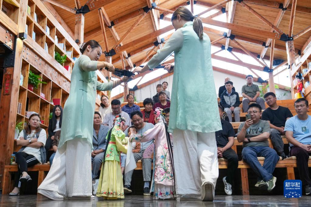 孫菁(前左)和施錦芳在七都鎮江村文化禮堂表演昆曲木偶(5月17日攝)。
