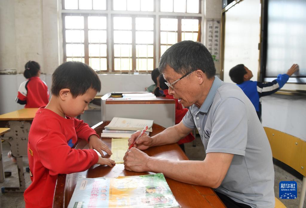 5月18日,在廣西靈川縣蘭田瑤族鄉深潭教學(xué)點(diǎn),趙洪老師在給學(xué)生輔導功課。