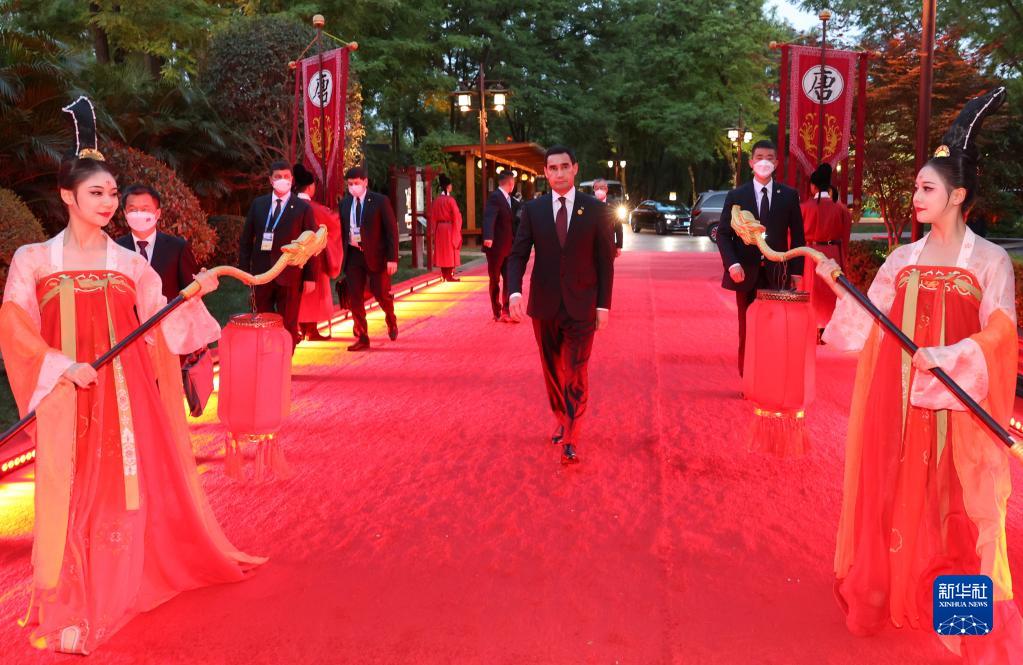 5月18日晚,出席中國-中亞峰會(huì )的中亞國家元首夫婦陸續抵達陜西省西安市大唐芙蓉園,參加在這里舉行的歡迎儀式。這是土庫曼斯坦總統別爾德穆哈梅多夫抵達。新華社記者 徐子鑒 攝