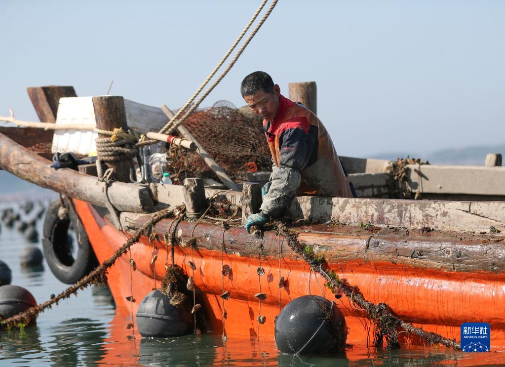 5月18日,廣鹿島鎮的漁民將生蠔苗投入海中。