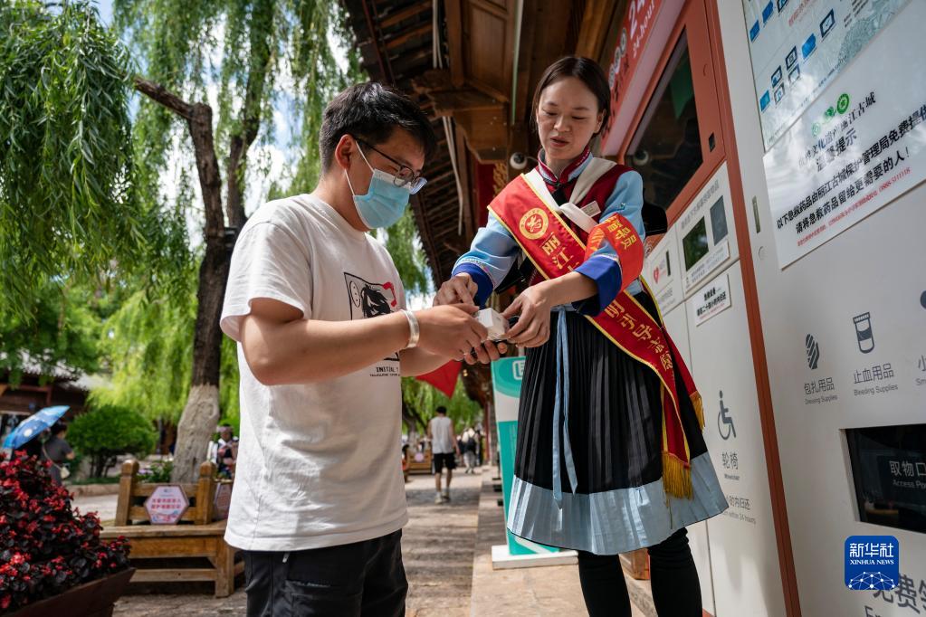 5月18日,一名志愿者(右)在麗江古城幫助游客通過(guò)24小時(shí)智能急救站領(lǐng)取小傷口處理用品。