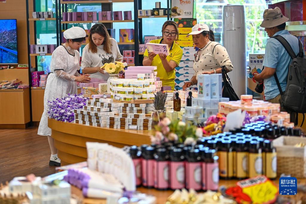 游客在新疆伊犁哈薩克自治州伊寧縣天山花海國家農業(yè)產(chǎn)業(yè)園服務(wù)中心選購特色產(chǎn)品(5月18日攝)。
