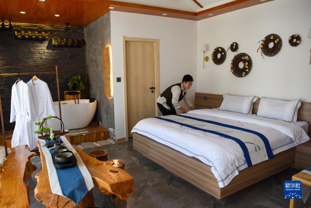 新疆伊犁哈薩克自治州霍城縣大西溝鄉桃花村一家民宿的老板在整理客房(5月17日攝)。