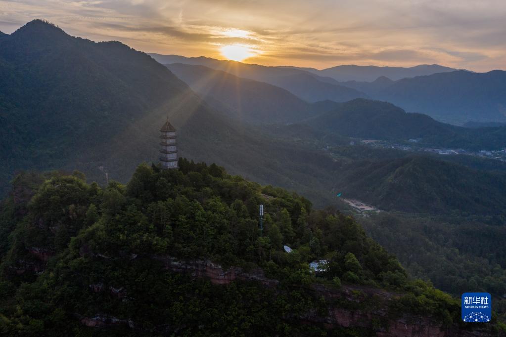 5月16日,在浙江省臺州市天臺縣,清晨的陽(yáng)光照在赤城山頂的梁妃塔上(無(wú)人機照片)。