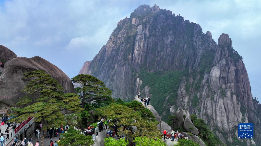 5月18日,游客在安徽黃山風(fēng)景區玉屏景區游覽(無(wú)人機照片)。