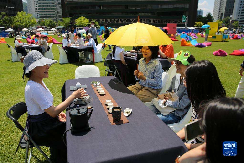 5月19日,人們在韓國首爾廣場(chǎng)品嘗中國茶。