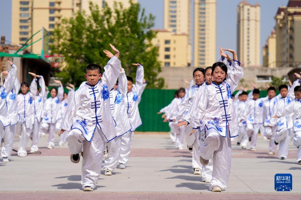5月19日,河北省灤南縣第三實(shí)驗小學(xué)學(xué)生在操場(chǎng)上練習武術(shù)。