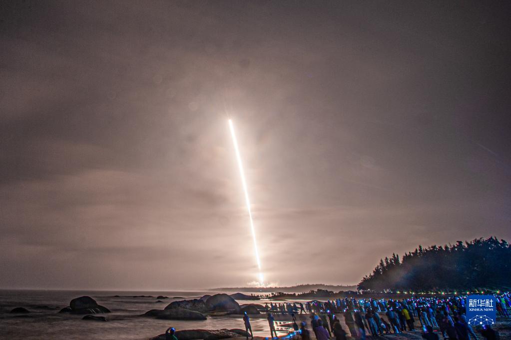 大批觀(guān)眾在海南省文昌市淇水灣觀(guān)看、拍攝火箭發(fā)射(2021年3月12日攝)。