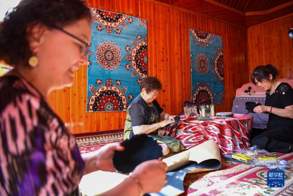 在伊寧市六星街,居民在家中制作手工花帽(5月19日攝)。