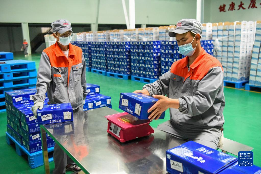 在位于新疆伊寧市的伊犁伊牧欣乳業(yè)有限公司,工人在包裝車(chē)間忙碌(5月19日攝)。