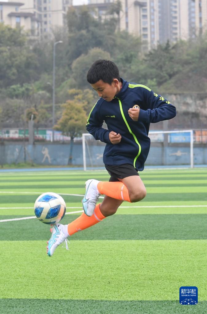 在瀘州天立春雨學(xué)校足球場(chǎng),來(lái)自涼山彝族自治州的楊坤在進(jìn)行訓練(3月29日攝)。