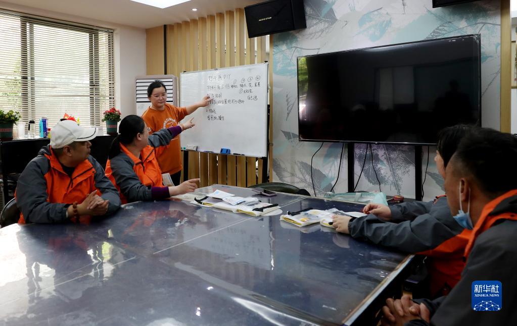 劉瑩(后)在上海虹口區曲陽(yáng)社區陽(yáng)光心園在助手(左二)幫助下為學(xué)員們上手工課(4月11日攝)。