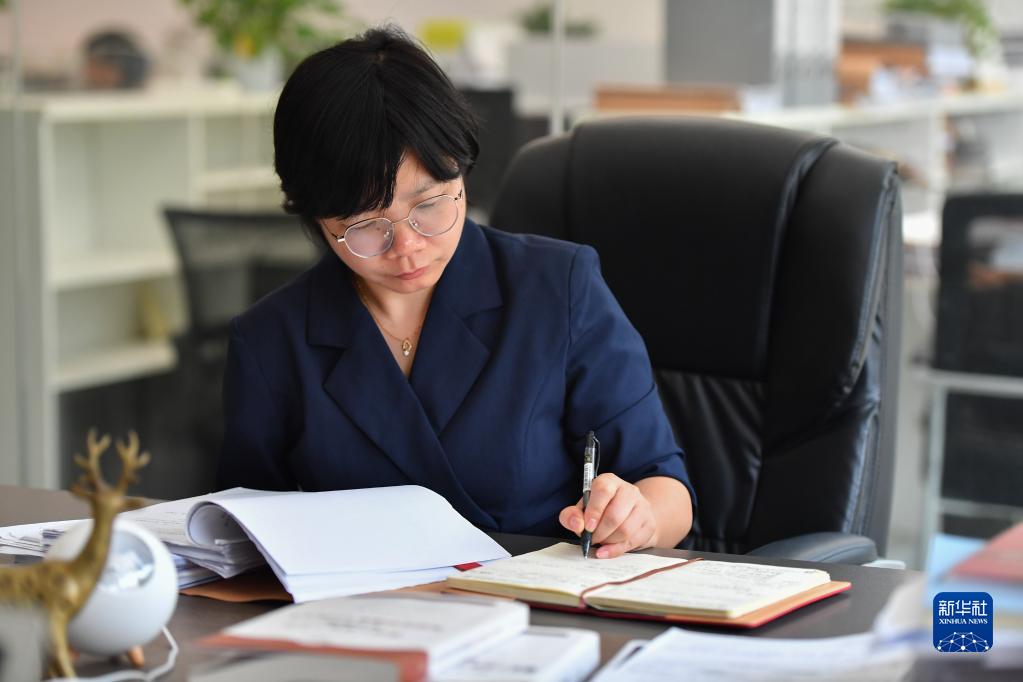 扶婷在湘潭市雨湖區的律所里查看法律文書(shū)時(shí)做記錄(5月18日攝)。