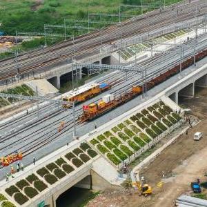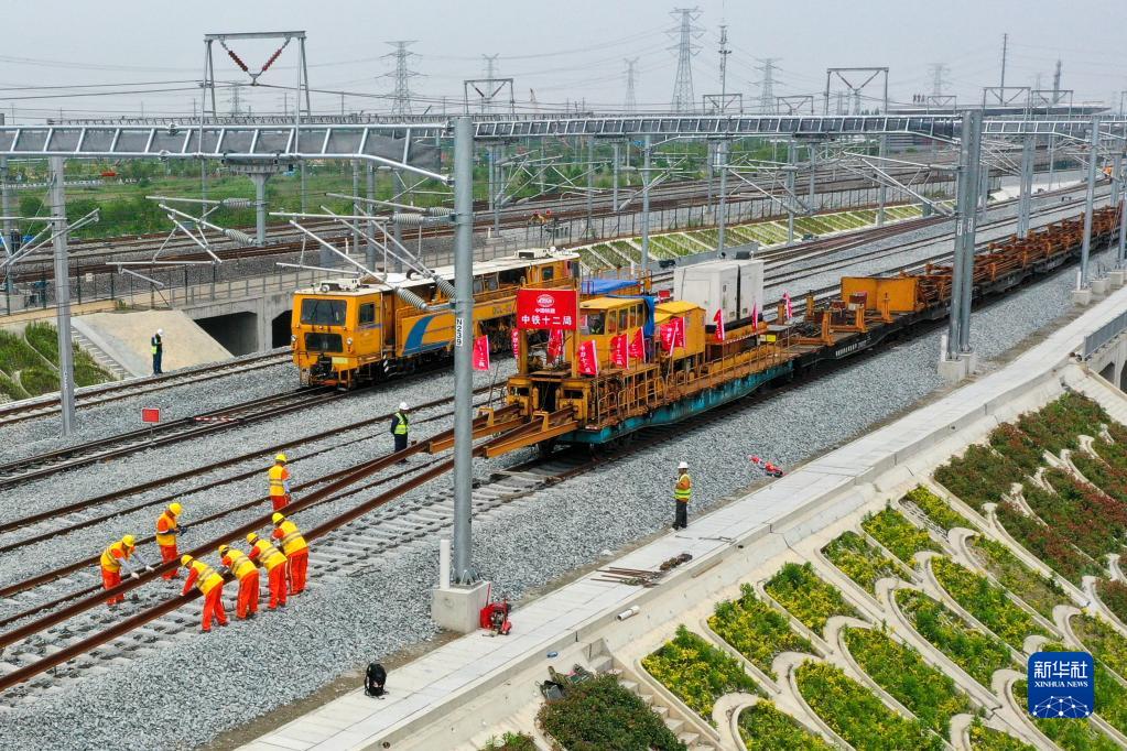 5月20日,在滬寧沿江高鐵太倉站施工現場(chǎng),中鐵十二局的工程人員利用機械將鋼軌放入承軌槽(無(wú)人機照片)。