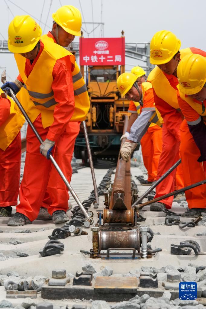 5月20日,在滬寧沿江高鐵太倉站施工現場(chǎng),中鐵十二局的工程人員利用機械將鋼軌放入承軌槽。
