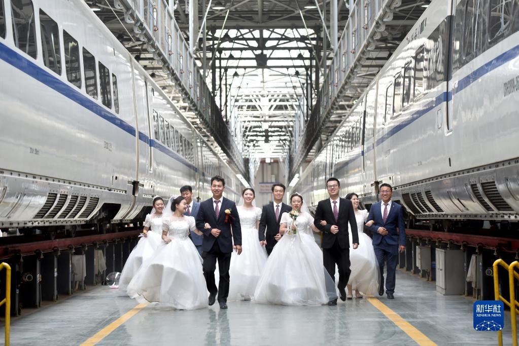 5月20日,新人們以休整中的動(dòng)車(chē)組列車(chē)為背景拍攝婚紗照。