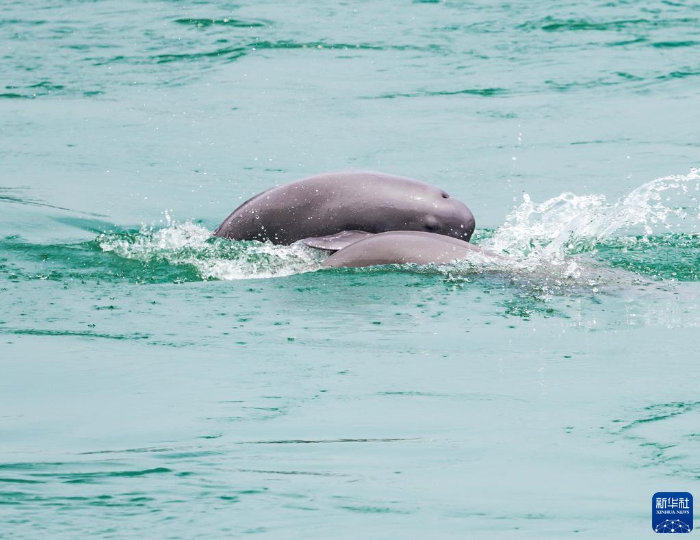 5月20日,江豚在湖北省宜昌市葛洲壩下游水域逐浪嬉戲。