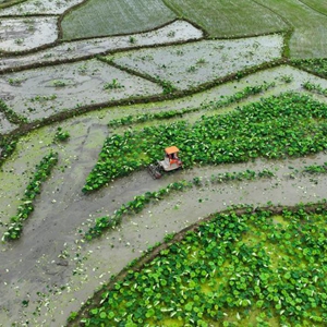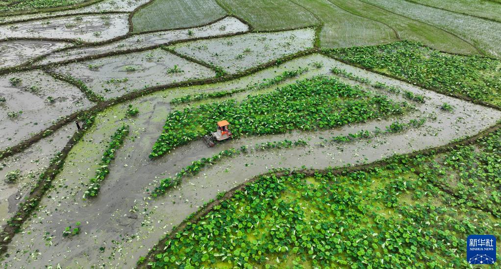 5月20日,湖南省常寧市廟前鎮雙鳳村的農民駕駛農機在蓮田里勞作(無(wú)人機照片)。