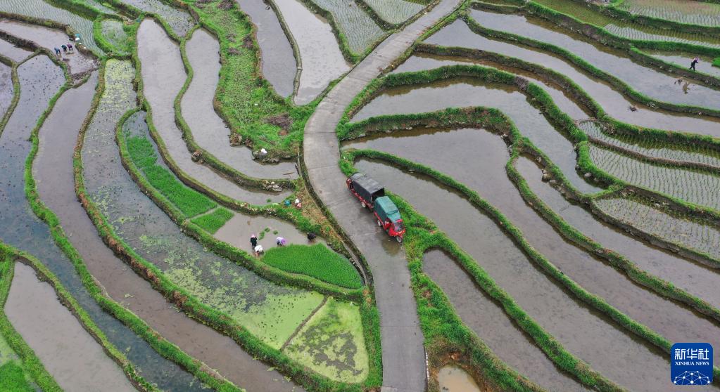 5月20日,在貴州省黔東南苗族侗族自治州從江縣剛邊壯族鄉高麻村,農民在梯田里勞作(無(wú)人機照片)。