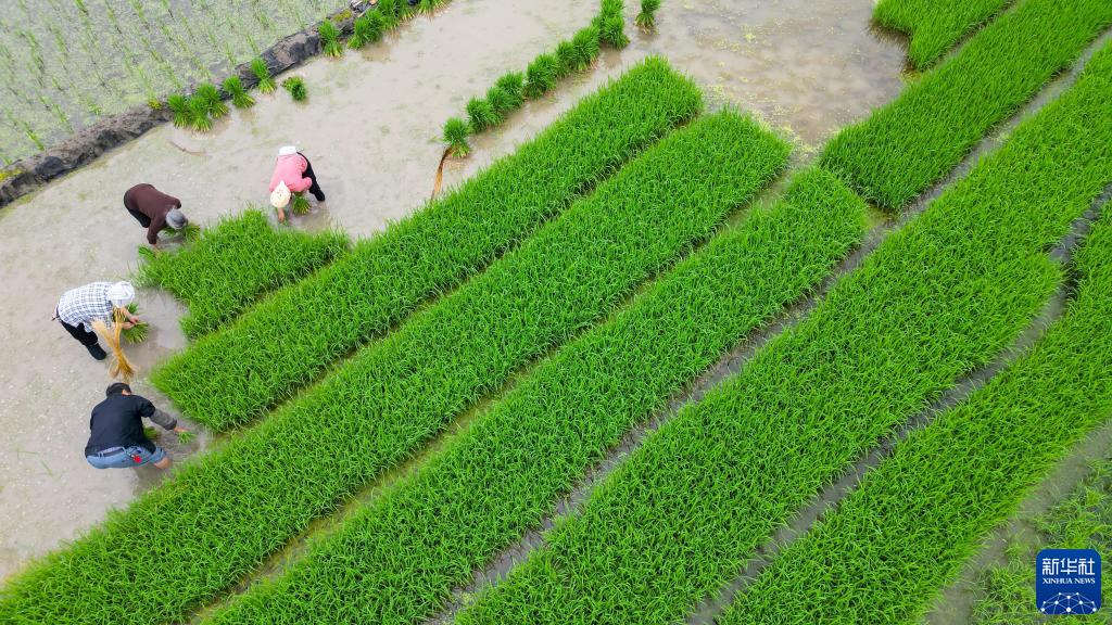 5月20日,在貴州省黔東南苗族侗族自治州從江縣貫洞鎮貫洞村,村民在田間拔秧(無(wú)人機照片)。
