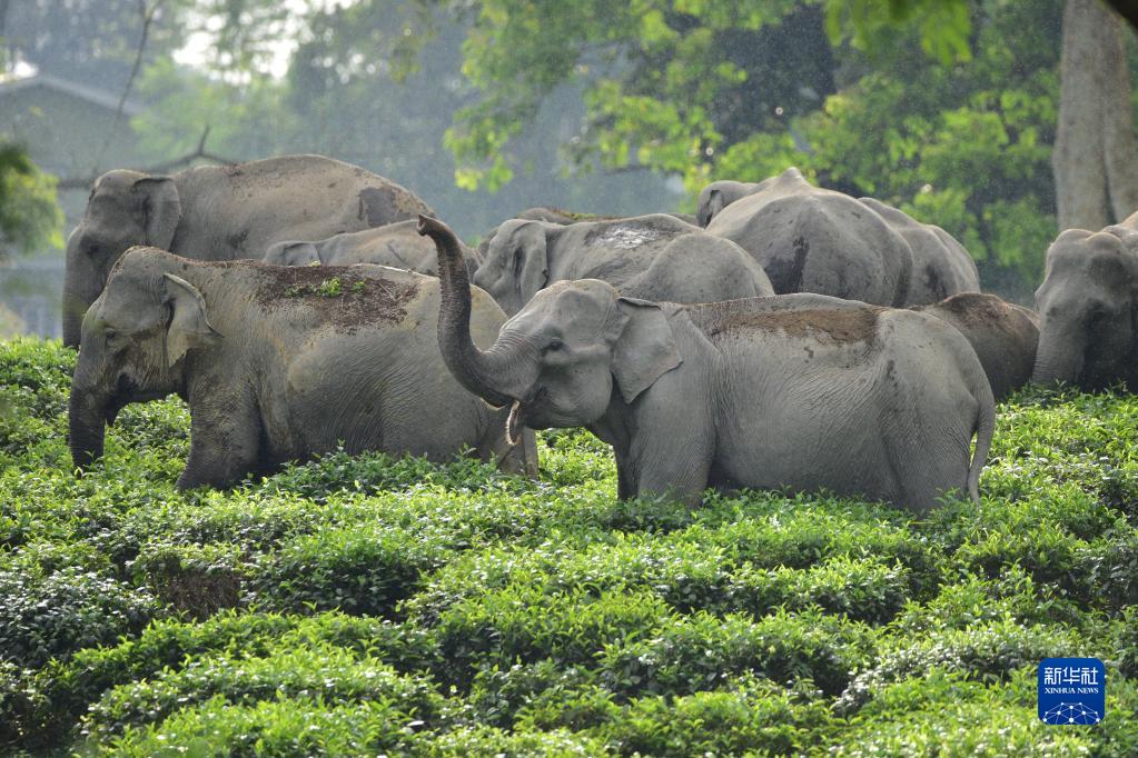 這是2022年9月15日,在印度阿薩姆邦納加奧恩地區靠近卡齊蘭加國家公園的茶園里,一群野象在游逛。
