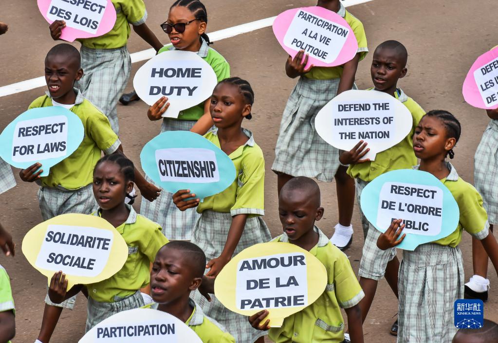 5月20日,在喀麥隆首都雅溫得舉行的國慶慶?;顒?dòng)上,少年兒童手舉標語(yǔ)牌列隊行進(jìn)。