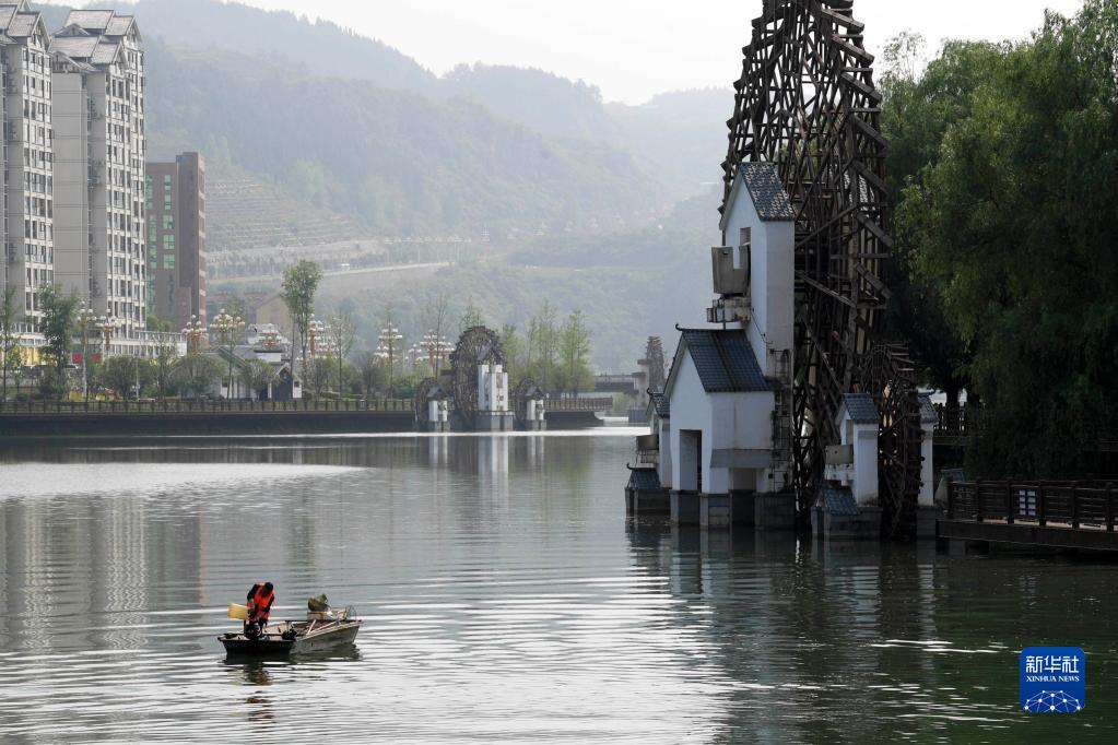 5月21日,清潔工人在貴州省黔東南苗族侗族自治州施秉縣?陽(yáng)河畔清理河面漂浮物。