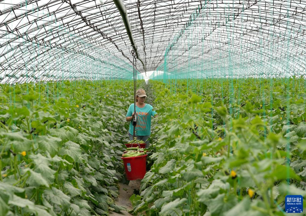 5月21日,河北省灤州市小馬莊鎮農民在大棚內采摘黃瓜。