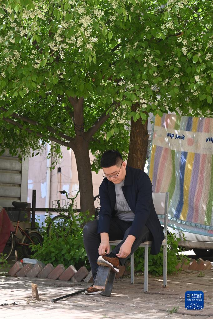 趙強在陽(yáng)光家園門(mén)前的小區樹(shù)下整理鞋帶(4月18日攝)。