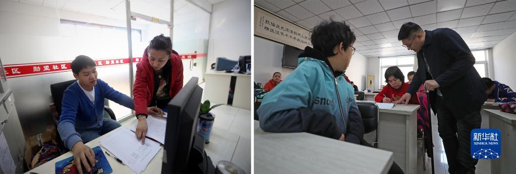 拼版照片: 左圖為2014年4月16日,趙強(左)在辦公室和同事交流工作(新華社記者姚劍鋒攝 );右圖為2023年4月18日,趙強(右)在陽(yáng)光家園輔導智力殘疾人學(xué)習知識(新華社記者楊青攝)。