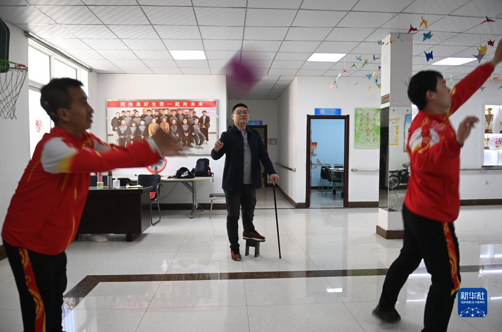 趙強(中)在陽(yáng)光家園指導學(xué)員練習籃球(4月18日攝)。