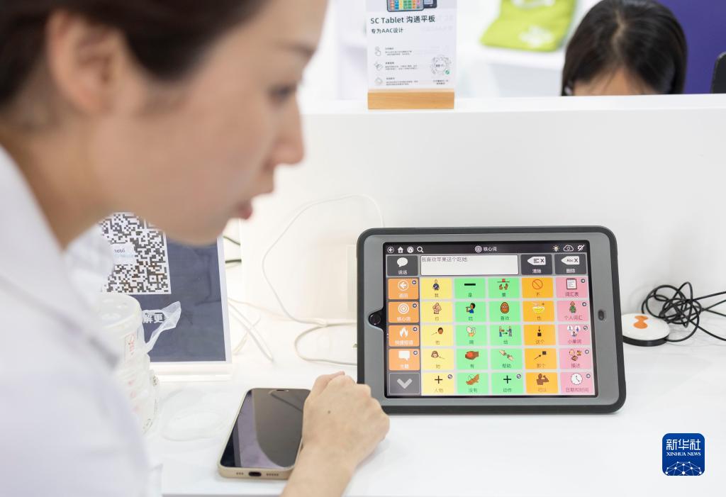 5月21日,在2023中國國際福祉博覽會(huì )上,一名工作人員演示SC Tablet溝通平板。這款設備可供自閉癥人群通過(guò)點(diǎn)選平板的各種表情符號表達需求,實(shí)現與家人的溝通交流。