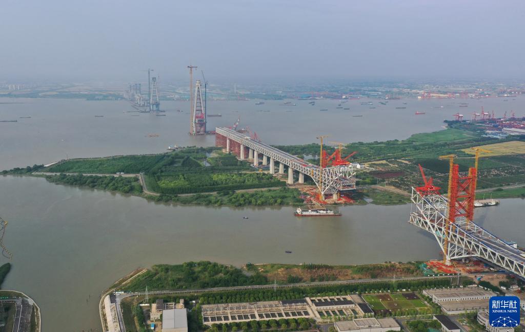建設中的常泰長(cháng)江大橋(5月21日攝,無(wú)人機照片)。