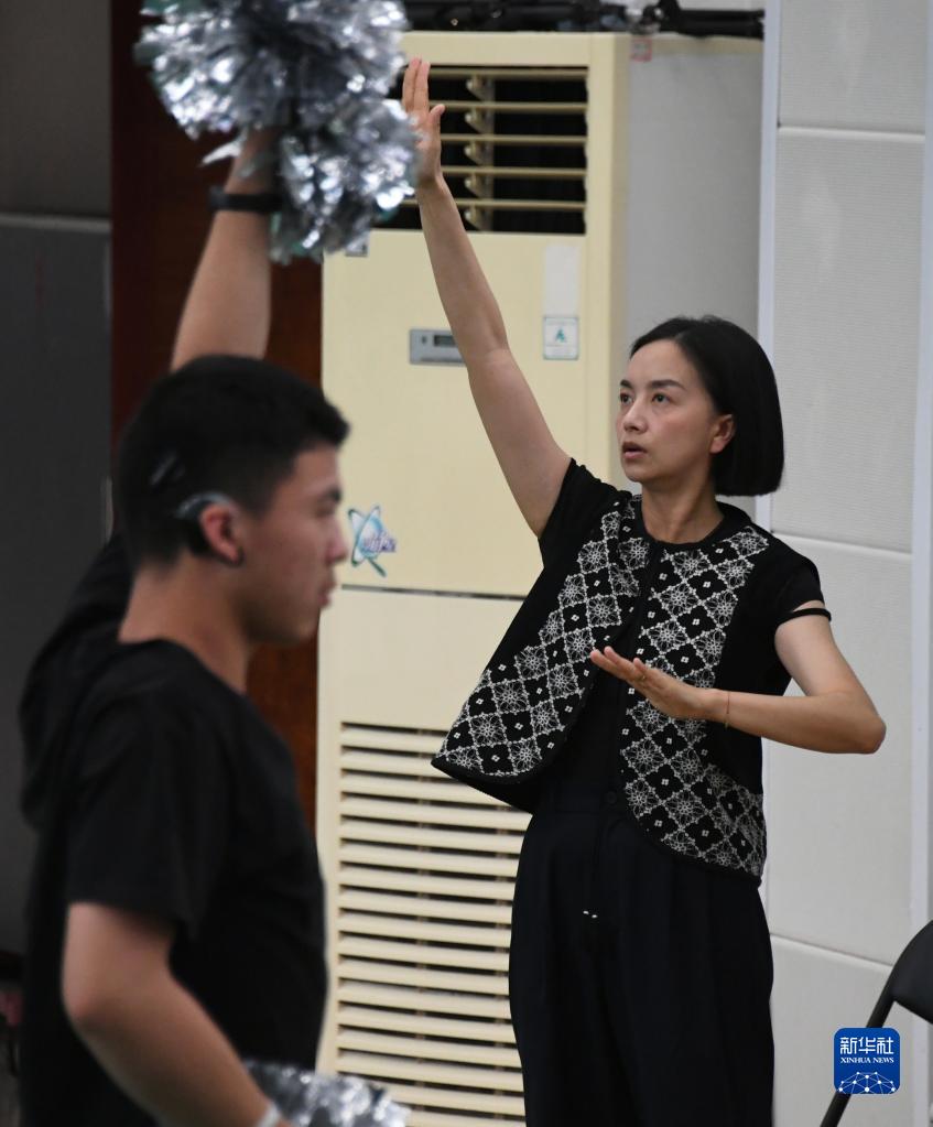 在北京市健翔學(xué)校,廖茜(右)指揮舞蹈團的學(xué)生訓練(5月11日攝)。