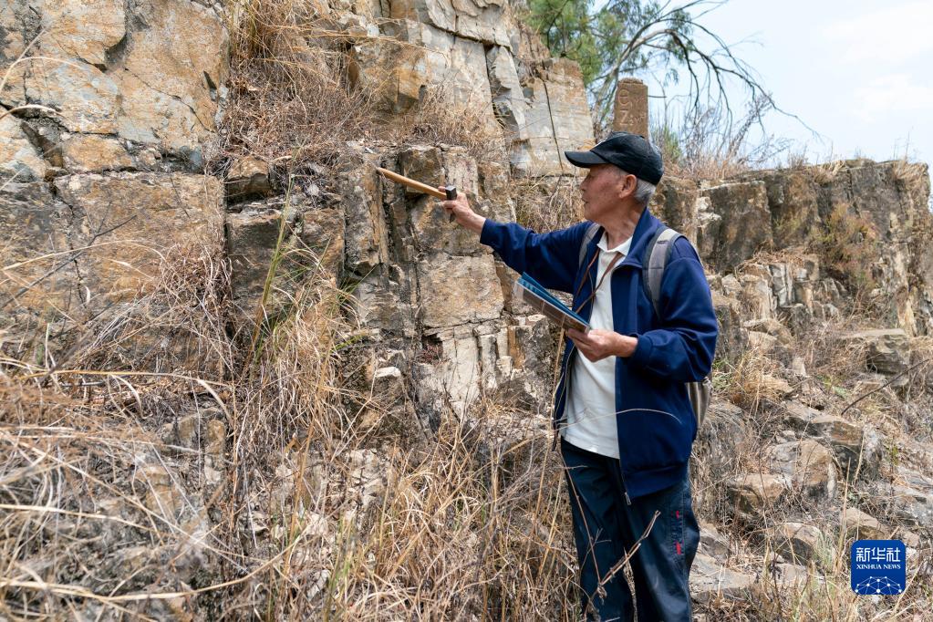 張世山在梅樹(shù)村剖面一處巖石斷層前查看巖石(5月10日攝)。