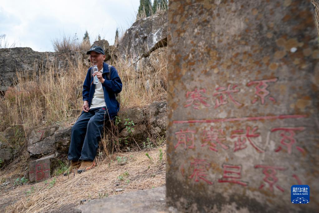 張世山在巡護梅樹(shù)村剖面途中休息(5月10日攝)。