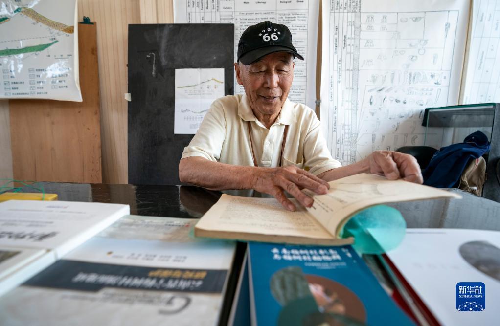 張世山在收藏化石的標本館內翻閱古生物化石書(shū)籍(5月10日攝)。
