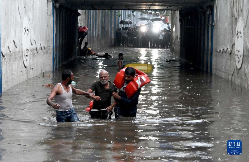 5月21日,在印度班加羅爾,救援人員在一處漲水的涵洞協(xié)助被困人員離開(kāi)。